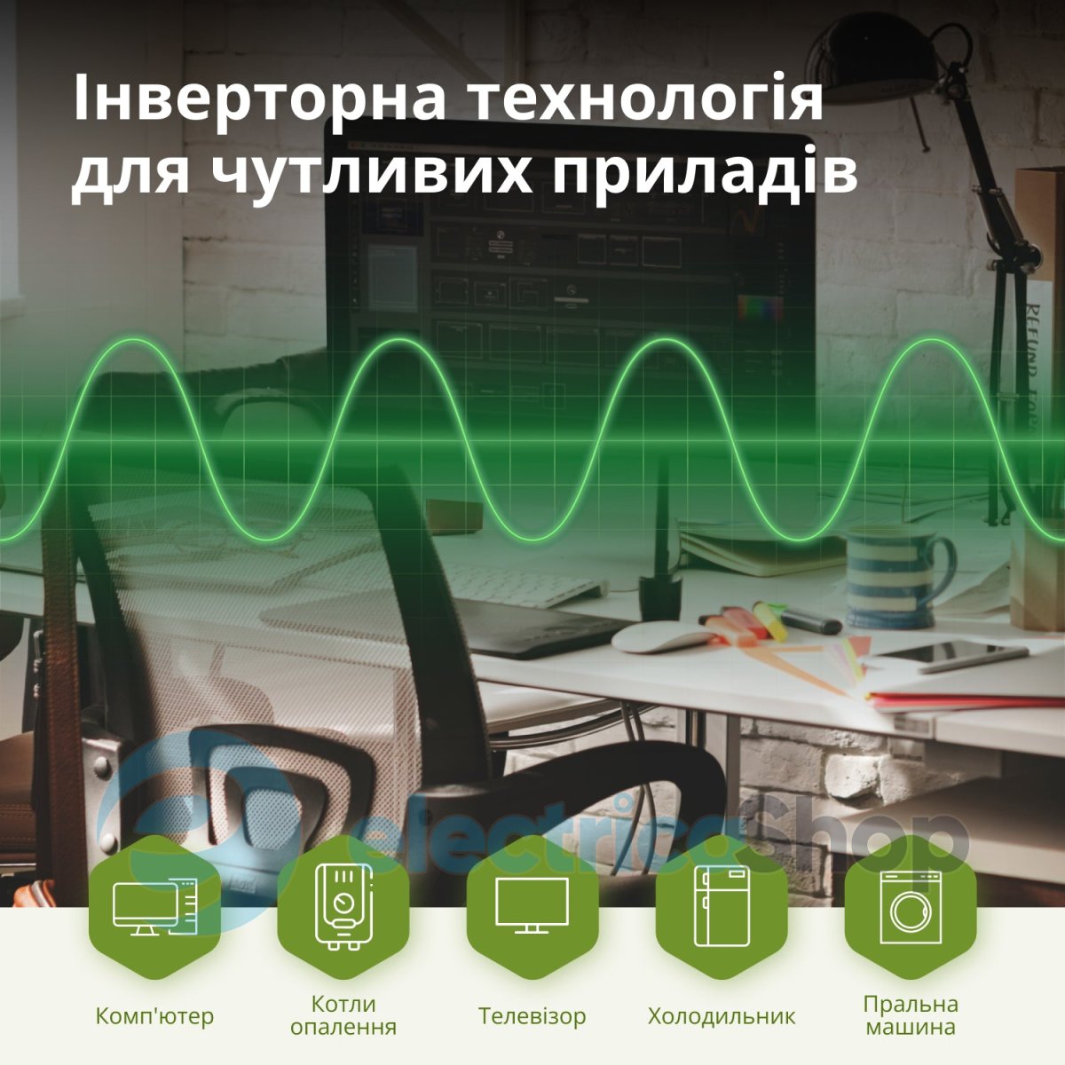 - Інверторна технологія: Забезпечує стабільну вихідну напругу правильної синусоїдальної форми, що підходить для надійної роботи чутливої електроніки.