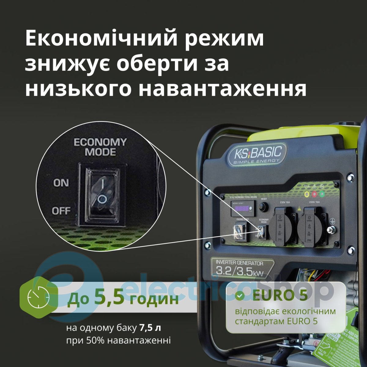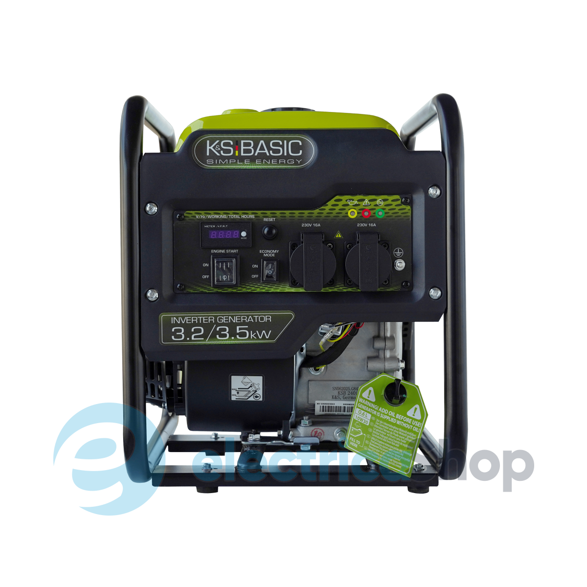 Інверторний генератор KSB 35i німецької торгової марки Könner & Söhnen® з максимальною потужністю 3,5 кВт забезпечує стабільну напругу 230В 50Гц, інверторна технологія забезпечує стабільну й чисту синусоїду, що дозволяє безпечно використовувати його для чутливої електроніки та сучасної техніки.Надійний двигун K&S відповідає стандарту EURO 5, а режим ECONOMY MODE знижує витрати палива. Панель керування має LED-дисплей, розетки 16А. Безщітковий альтернатор з мідною обмоткою витримує високі навантаження. Компактні розміри й опорні ніжки забезпечують зручність у використанні і стійкість.