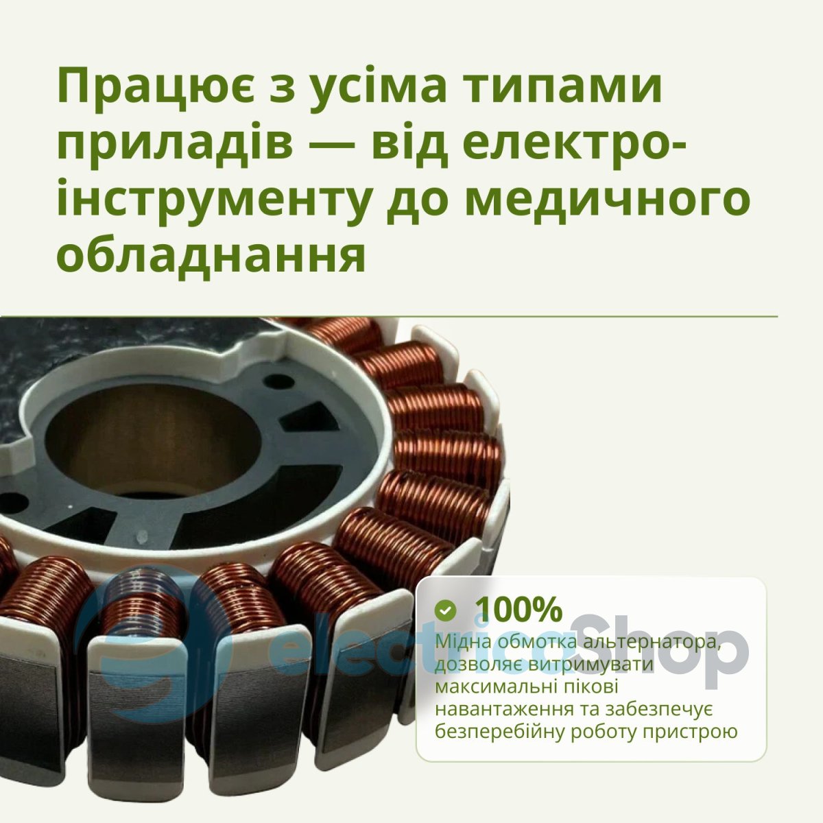 - 100% мідна обмотка альтернатора – забезпечує стабільну генерацію електроенергії, зменшує ризик перегріву та продовжує термін експлуатації пристрою.