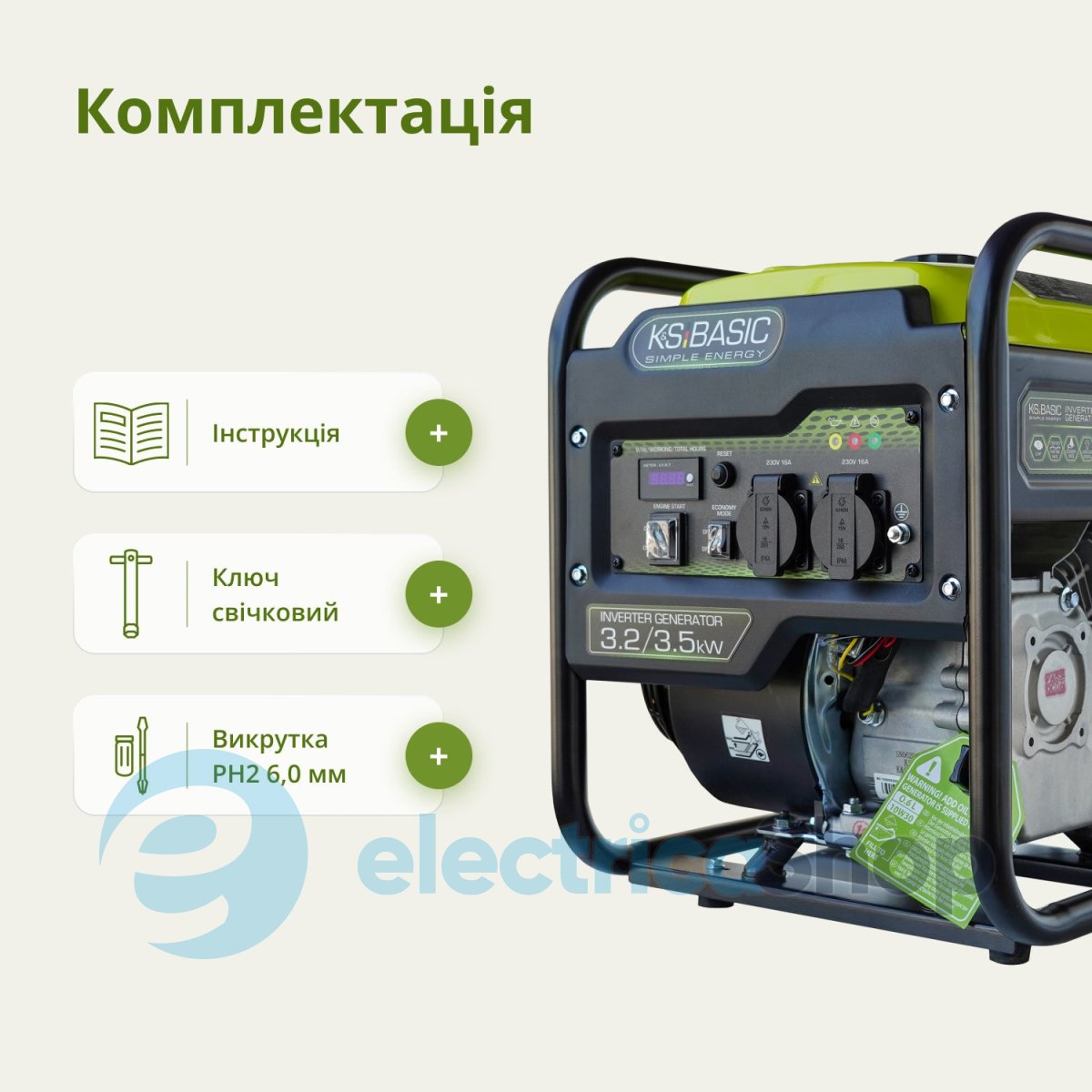 - Комплектація:Генератор, Упаковка, Інструкція, Ключ свічковий, Викрутка РН2 6,0 мм