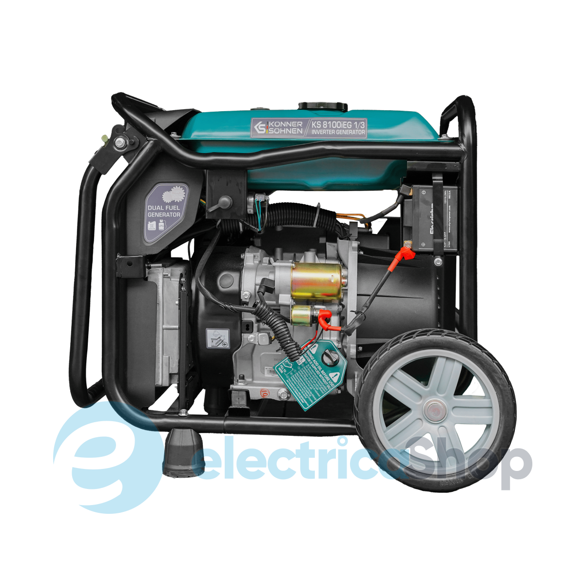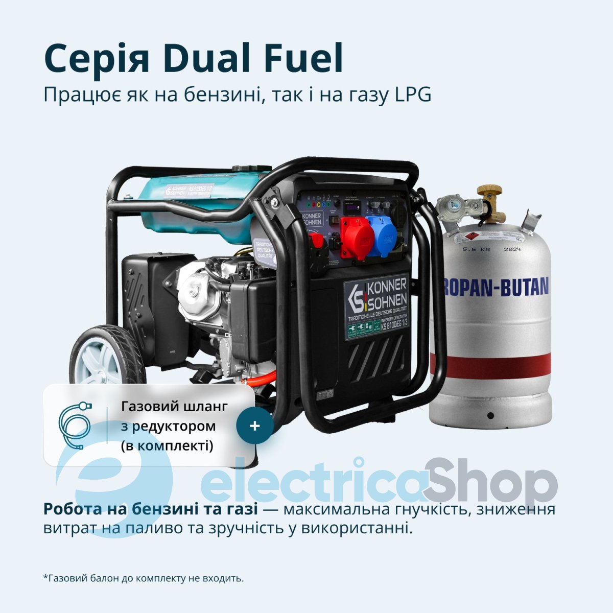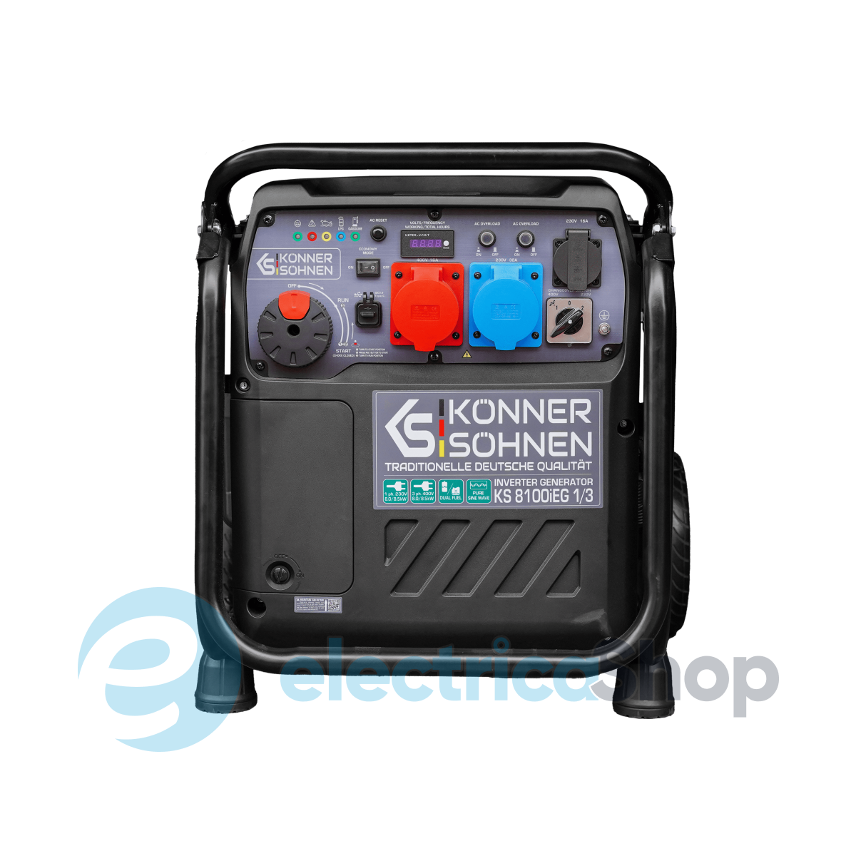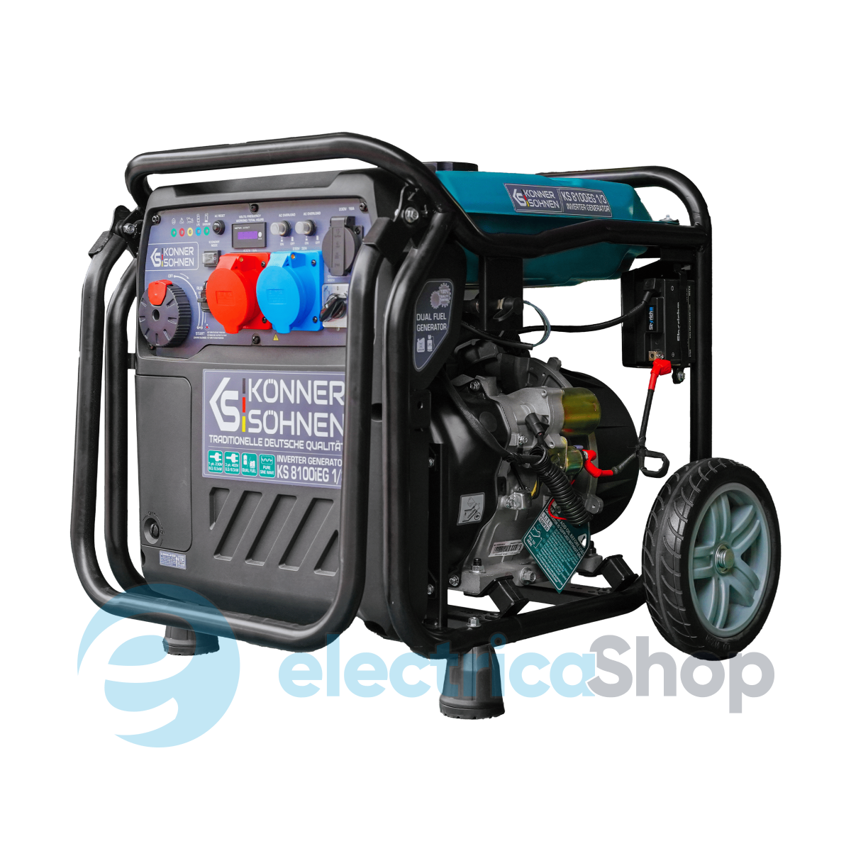 Інверторний генератор KS 8100iEG 1/3 з двопаливним двигуном (газ/бензин), макс. потужність 8,5 кВт при роботі на бензині, на газі потужність зменшується на 10%. Оснащений системою VTS для перемикання між одно- та трифазним режимами без втрати потужності. Стабільна напруга 230В 50Гц забезпечує безпеку чутливої електроніки, такої як мед. обладнання, аудіо- та відеотехніка. Легкий запуск «3 в 1»,якісний альтернатор з мідною обмоткою.Зручна панель керування з LED-дисплеєм, USB, розетками 1×16A (230B),1×32A (230B),1×32A (230B.) У комплект входять всі необхідні аксесуари для використання газу: вбудований редуктор, шланг 1,5 м і додатковий редуктор для підключення до газового балона.