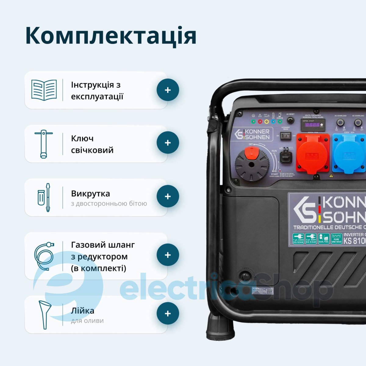 - Комплектація:Генератор, Упаковка, Інструкція, ключ свічковий, шланг з редуктором, викрутка РН2 6,0 мм, лійка, додатковий редуктор, що кріпиться на балон, шланг підключення до газового балону (1,5 м), 2×Транспортувальні колеса, Транспортувальна ручка, 2×Опорні ніжки