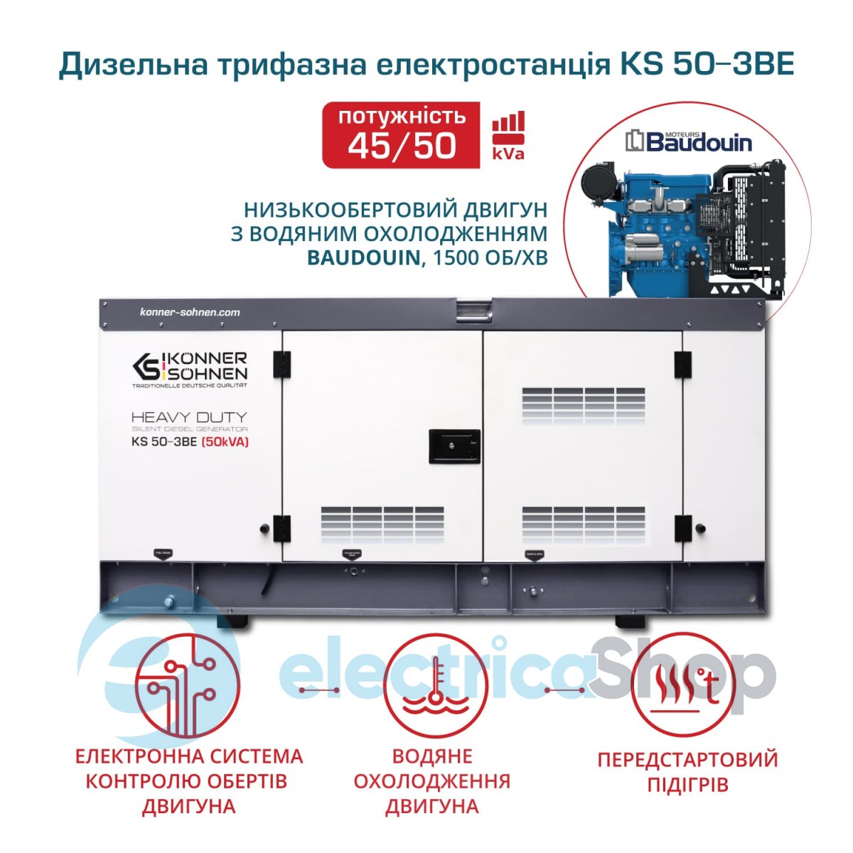 Дизельні 4-х циліндрові електростанції серії HEAVY DUTY німецької торгової марки Könner & Söhnen створені на базі надійних двигунів французького бренду Baudouin з водяним охолодженням.