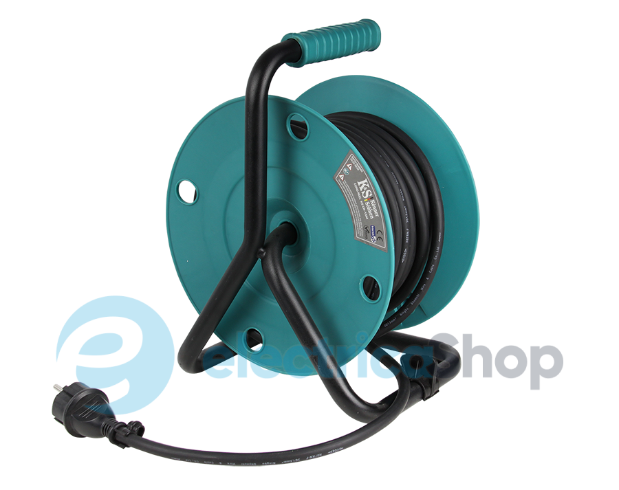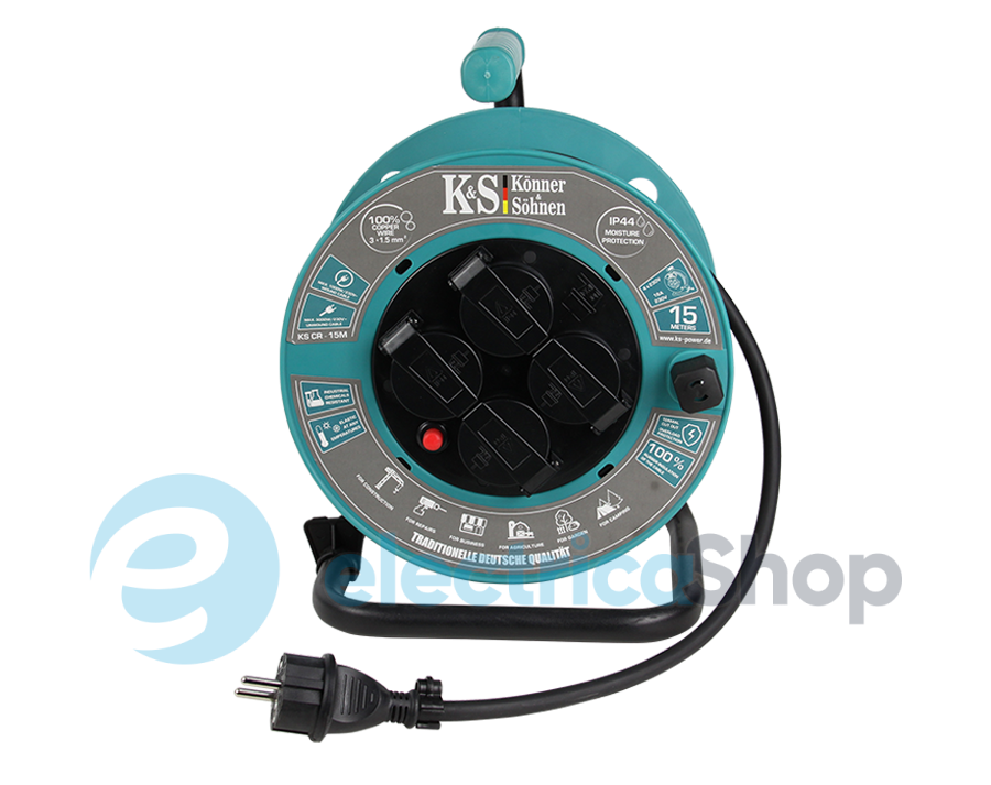 Котушка виготовлена зі спеціального посиленого пластику, має міцну металеву рамну конструкцію, стійку до пошкоджень. Оснащена ергономічною гумовою ручкою для комфортного переміщення, фіксатором кабелю, кріпленням для регулювання направлення кабелю, фіксатором для блокування довільного розкручування котушки. Довжина кабелю сягає 15 метрів та підходить для віддаленого підключення до 4-х електричних приладів одночасно. -