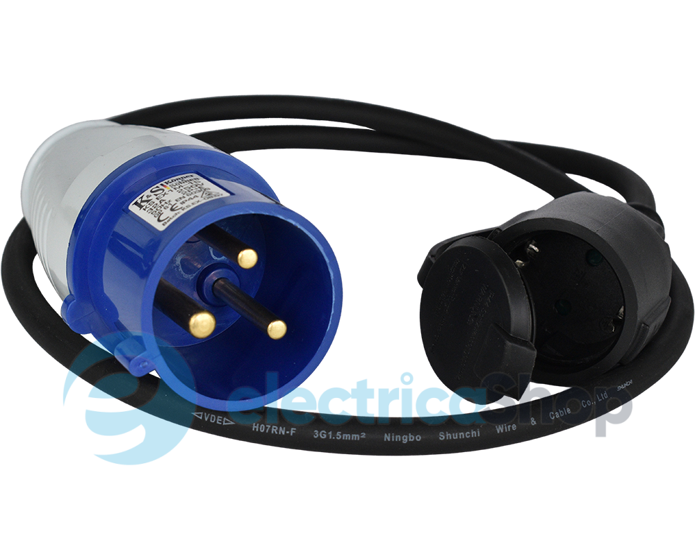 З одного боку адаптер має вилку 32А, з іншого — розетку 16А, що дозволяє підключити прилад зі звичайною вилкою 16А до джерела енергії з розеткою в 32А. Має загальну потужність до 3.6 кВт. -