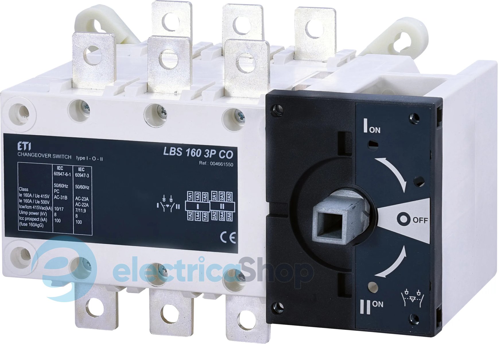 Перемикач навантаження LBS CO 3P 160 ("1-0-2", 160А) призначений для встановлення в розподільних щитах та застосовуються для комутації електричних кіл низької напруги зі струмом від 160А до 3200А.