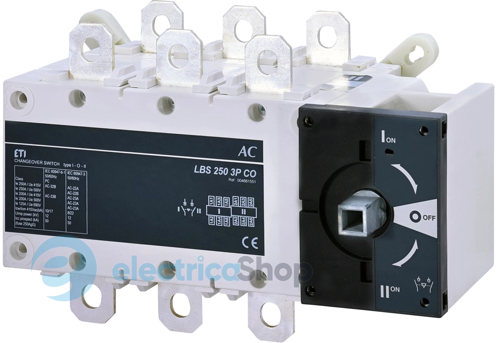 Перемикач навантаження LBS CO 3P 250 ("1-0-2", 250А) призначений для встановлення в розподільних щитах та застосовуються для комутації електричних кіл низької напруги зі струмом від 160А до 3200А.