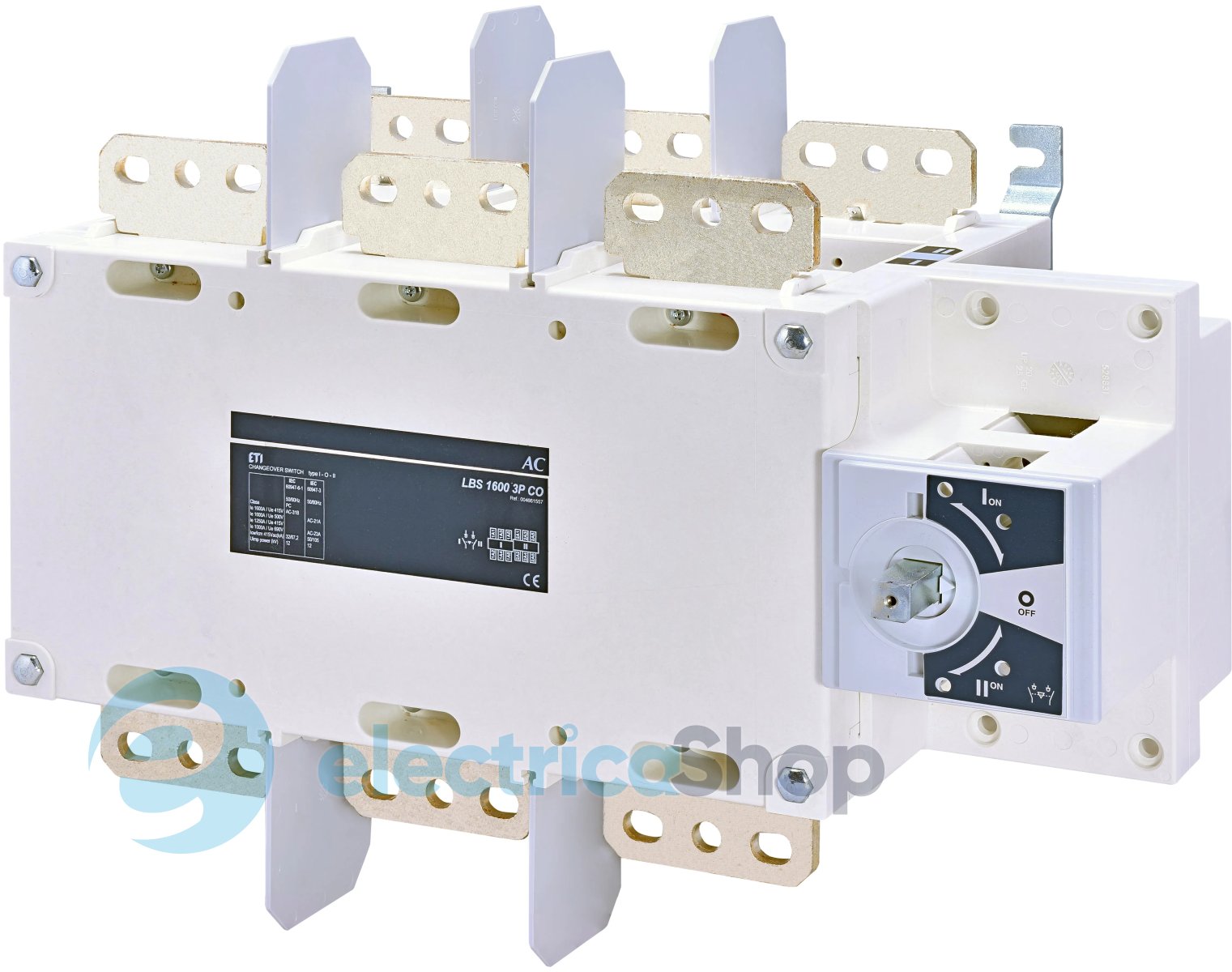 Перемикач навантаження LBS CO 3P 1600 ("1-0-2", 1600А) призначений для встановлення в розподільних щитах та застосовуються для комутації електричних кіл низької напруги зі струмом від 160А до 3200А.