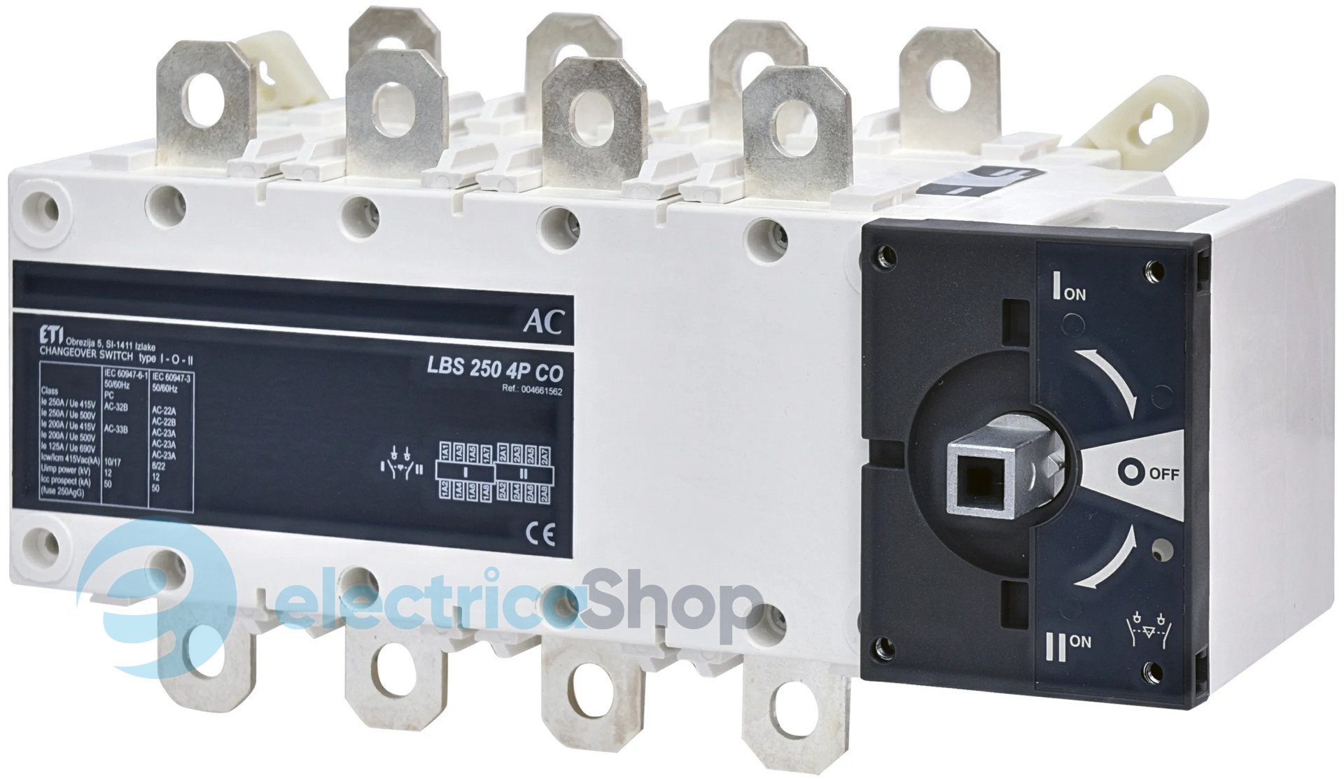 Перемикач навантаження LBS CO 4P 250 ("1-0-2", 250А) призначений для встановлення в розподільних щитах та застосовуються для комутації електричних кіл низької напруги зі струмом від 160А до 3200А.
