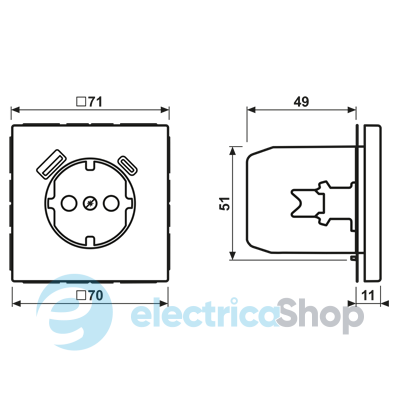 Розетка SCHUKO з USB тип AC LC1520-15CA201 має захист контактів (Safety Plus / захист від дітей) та встановлюється в монтажну коробку з розмірами згідно DIN 49073