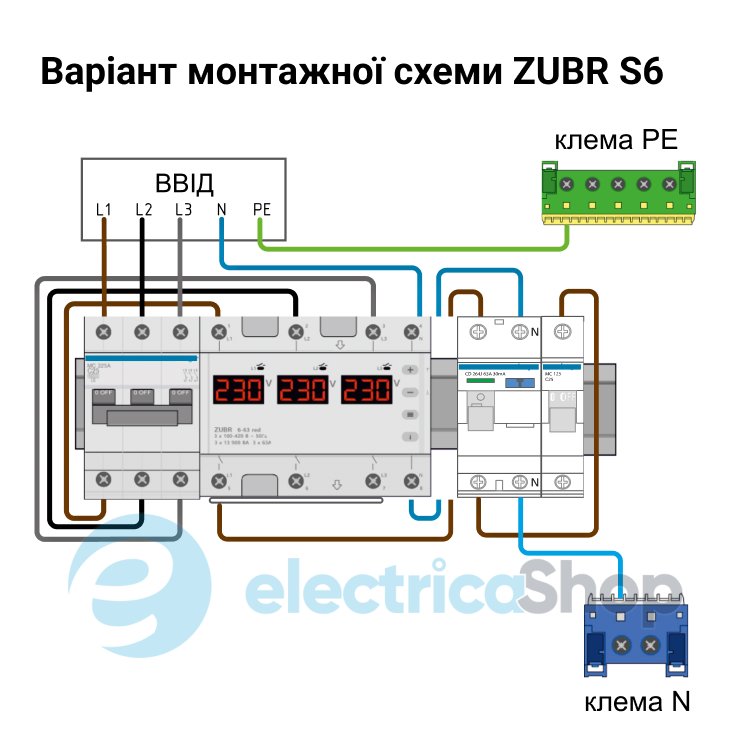 Перемикач фаз ZUBR S6 займає 6 стандартних модулів в розподільному щиті на стандартну DIN-рейку шириною 36 мм. Монтажну шину для замикання спільного нуля можна замінити на довшу, наприклад, спільну з автоматами. Якщо в приміщенні підвищена вологість або існує ймовірність попадання води на пристрій, тоді щиток повинен відповідати класу захисту IP20 (згідно з ДСТУ 14254).