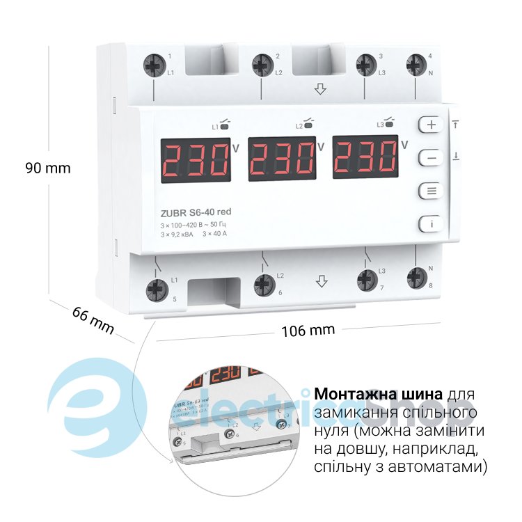 Принцип роботи перемикача фаз ZUBR S6-40 red — пристрій постійно аналізує напругу на всіх трьох фазах (L1, L2, L3). Якщо напруга на фазі, від якої живиться пріоритетне обладнання, виходить за встановлені межі або взагалі зникає — ZUBR перемикає живлення цього обладнання на іншу стабільну фазу. І звісно ж захищає ваше обладнання від критично високої та низької напруги.