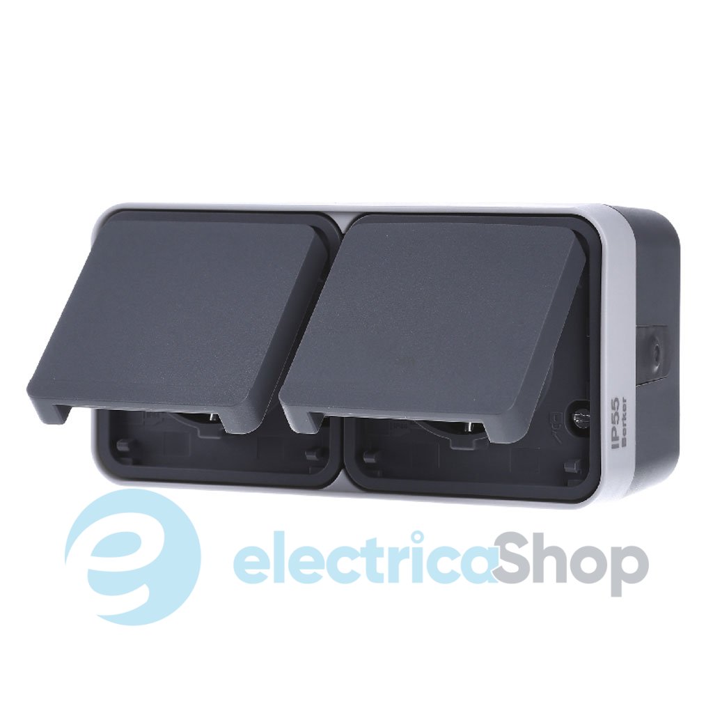 Електророзетка SCHUKO 2-місцева горизонтальна з відкидною кришкою, для зовнішнього монтажу.