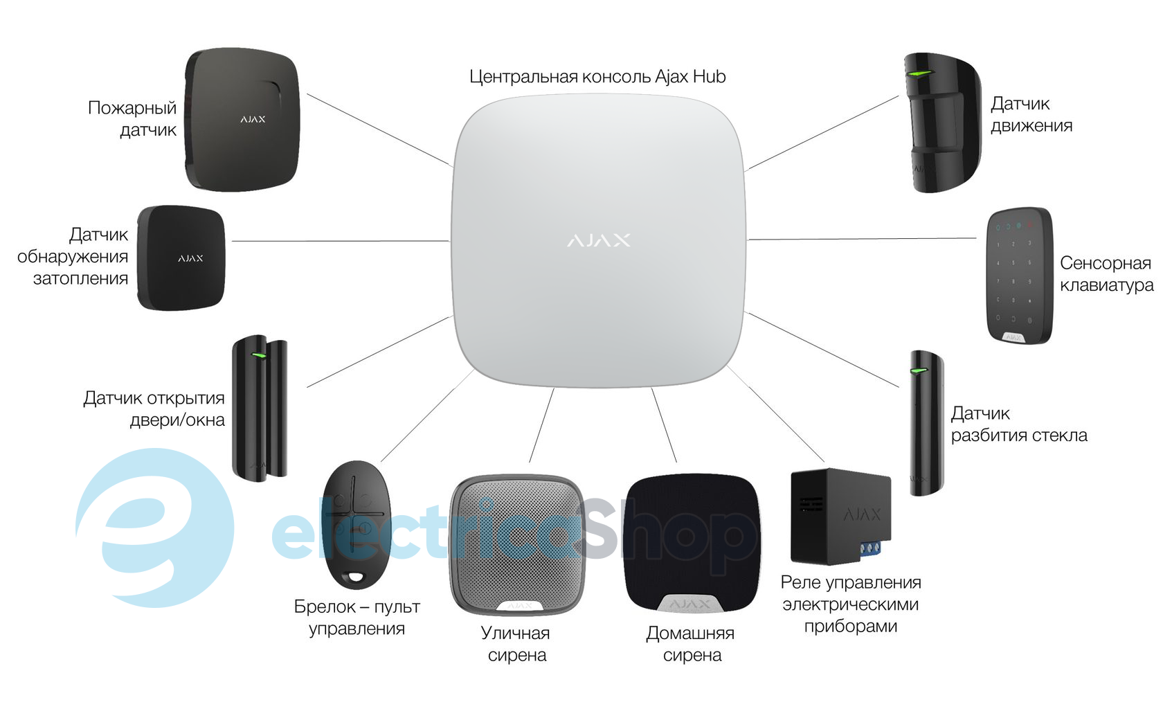 Hub white координує роботу системи безпеки Ajax, що підтримує підключення до 100 пристроїв по бездротовому протоколу Jeweller (дальність зв'язку в 2000 м при відсутності перешкод).