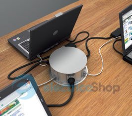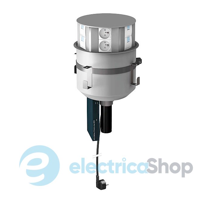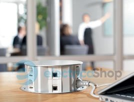 В неробочому положенні не виступає за поверхню столу. Після легкого натискання на кришку блок висувається вгору і робить розетки доступними для підключення. Після закінчення роботи блок втоплюється простим натисканням на його кришку.