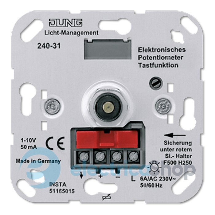 • Механізм електронного потенціометра для регуляції люмінесцентних ламп і / або електронних трансформаторів з 1-10V керуючого напруги, підходить для всіх колекцій Jung.