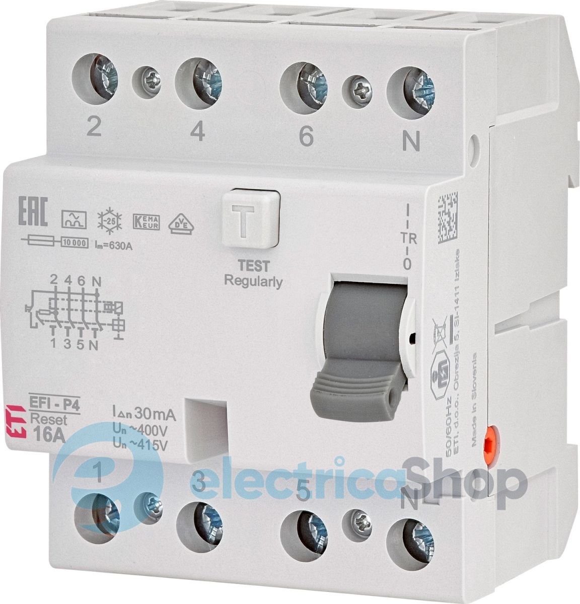 Диференційне реле EFI має функцію RESET, що переводить руків'я пристрою в середнє положення, тим самим візуально інформуючи, що відключення пристрою походить від захисних функцій. Застосовується з метою захисту від ураження електричним струмом при прямих або непрямих дотиках до струмопровідних частин, а також до частин, які можуть опинитися під напругою в результаті пошкодження ізоляції; для захисту обладнання від можливого виникнення пожежі.