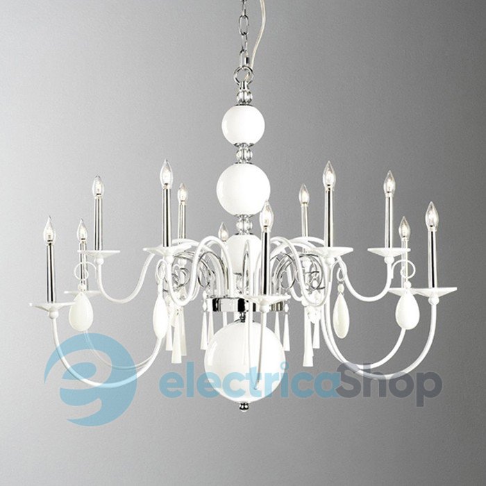 Люстра Illuminati MD8048-12A white Regina буде гарно виглядати в вітальні, спальні, їдальні, кухні та інших класичних і сучасних інтер'єрах. Основа виготовлена з металу і декорована підвісками і кулями зі скла білого кольору. Довжину люстри можна регулювати.