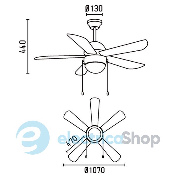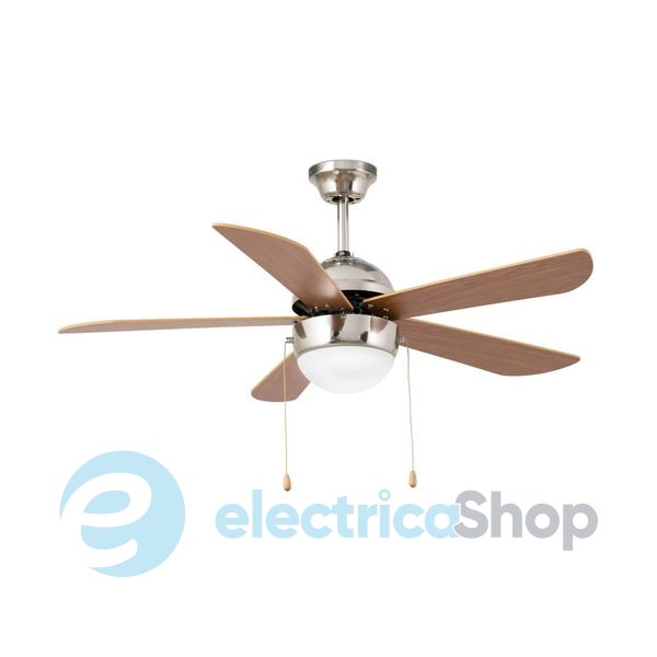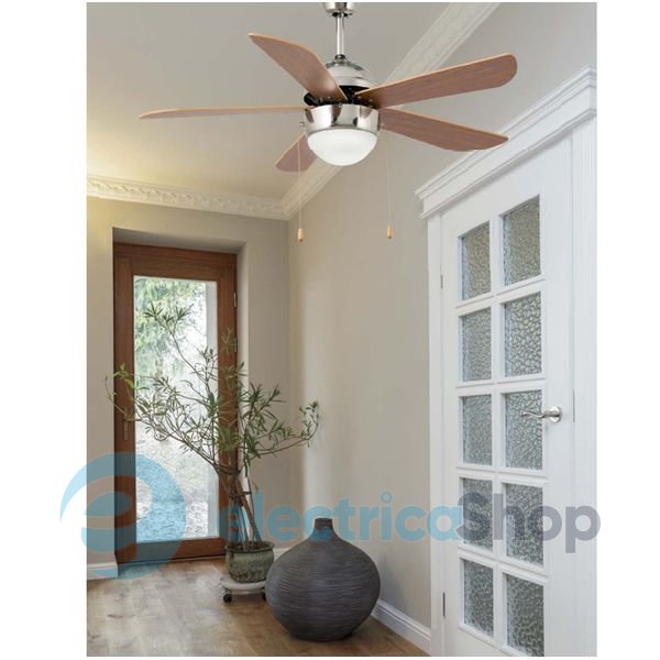 Стельовий вентилятор ідеально підходить для кімнат до 17,6m2. Двигун виготовлений зі сталі, лопаті з МДФ. Плафон з білого скла. Одна лампочка Е27 40Вт не входить в комплект. Вентилятор має 3 регульованих швидкості із споживанням 29-41-56W и 123-189-251 обертів на хвилину. Цей сучасний вентилятор має два режими-зима, літо. Вага вентилятора - 5,15 кг. Гарантія на двигун - 15 років. Вентилятор можна встановлювати на пряму стелю, а також на звід, кут якого не перевищує 30 °.