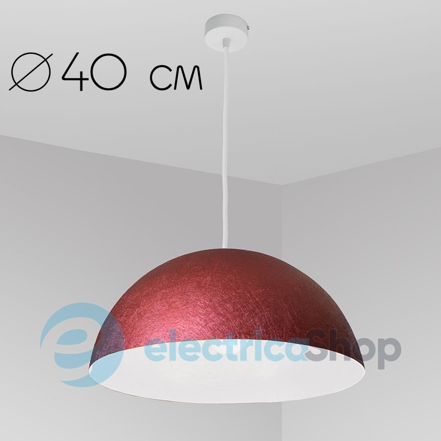 Підвісний світильник ImperiumLight 07140.50.01 D.40 см, червоне вино (металік) / білий дуже добре буде виглядати в кафе, барах, ресторанах, в офісних приміщеннях, а також підкреслить індивідуальність вашого будинку. Лаконічний дизайн і модний колір дає можливість використовувати світильник в сучасних інтер'єрах. Діаметр підвісу - 40 см, висота плафону - 20 см, довжина світильника - 150 см.