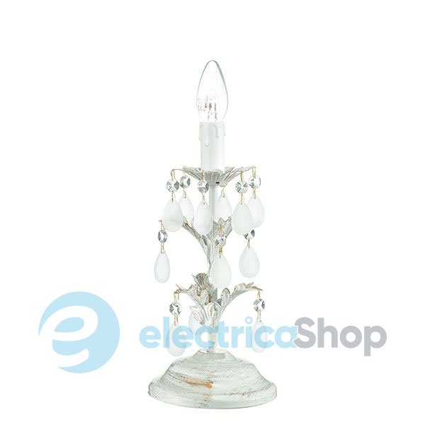 Настільна лампа Ideal Lux 100319 CASCINA стане окрасою приміщення, оформленого в класичному стилі. Підвіски виготовлені з окисленого прозорого скла. Арматура та декоративні елементи виготовлені у вигляді листка з модельованого вручну метала. вручну пофарбована бело-золотистою фарбою.