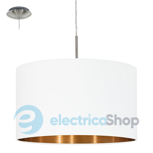 Люстра 95044 Eglo PASTERI буде мати гарний вигляд у приміщеннях, оформлених в сучасному стилі. Арматура освітлювального приладу виготовлена з металу, плафон - з тканини (білого кольору зовні та мідного всередині).