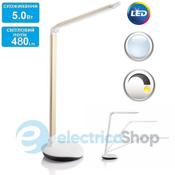 Настільна лампа Philips Lever LED Gold призначена для офісів, домашніх робочих кабінетів, вітальні, спальні та інших приміщень, де потрібне оптимальне освітлення робочого простору. Яскравість настільного світильника регулюється за допомогою димера (купується окремо). Оснащений витонченою алюмінієвою ніжкою з поворотним механізмом, за допомогою якої світло можна направляти під потрібним кутом, і чотирирівневим регулюванням освітлення.