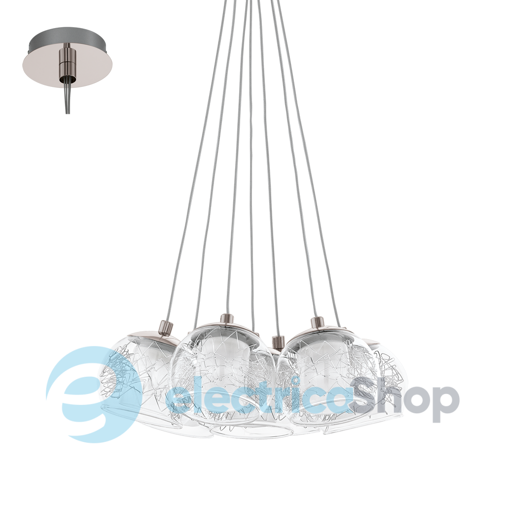 Трендовий підвіс 94327 EGLO з серії «POLDRAS». Основа виготовлена зі сталі кольору нікель матовий, а плафони з прозорого скла (всередині декоровані алюмінієвою ниткою).