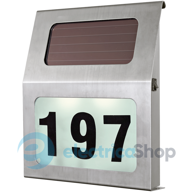 Вуличний світлодіодний світильник на сонячній батареї 90497 австрійського бренду Eglo™ з колекції «SOLAR». Основа світильника виготовлена з нержавіючої сталі. Світильник служит для підсвічування номера будинку. Оснащений кнопкой для увімкнення на корпусі.