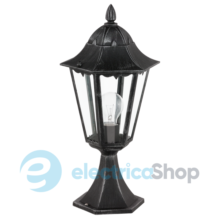 Вуличний світильник-стійка 93462 австрійського бренду Eglo™ з колекції «NAVEDO». Основа стойки виготовлений з алюмінію чорного та сріблястого кольорів. Плафон прозорий зі скла.