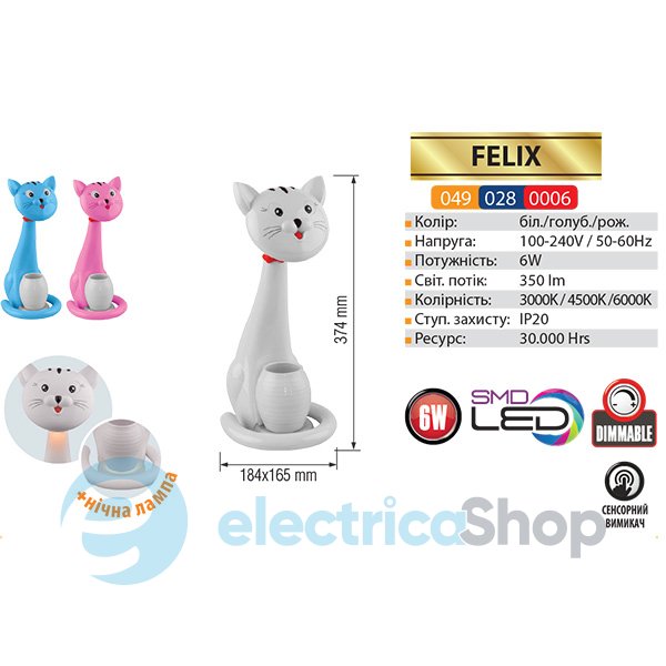 - Функції: Режим нічника, З вимикачем, Сенсорний вимикач