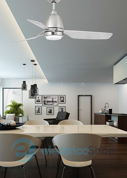 Люстра-вентилятор Faro 33468 Fogo – хороший варіант для сучасних готелів, офісів, а також для житлових приміщень. Двигун виготовлений зі сталі, лопаті - з пластику, плафон - з білого скла.