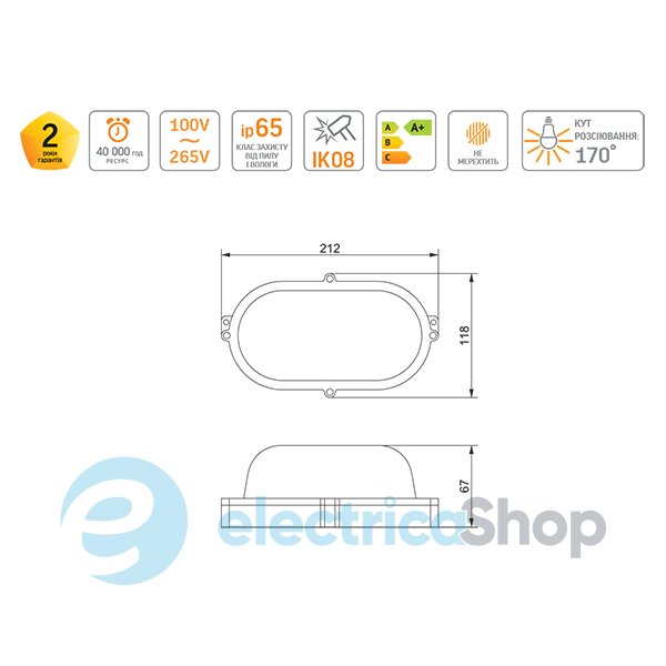 Після монтажу світильник не потребує обслуговування протягом усього періоду експлуатації.Технічні дані: