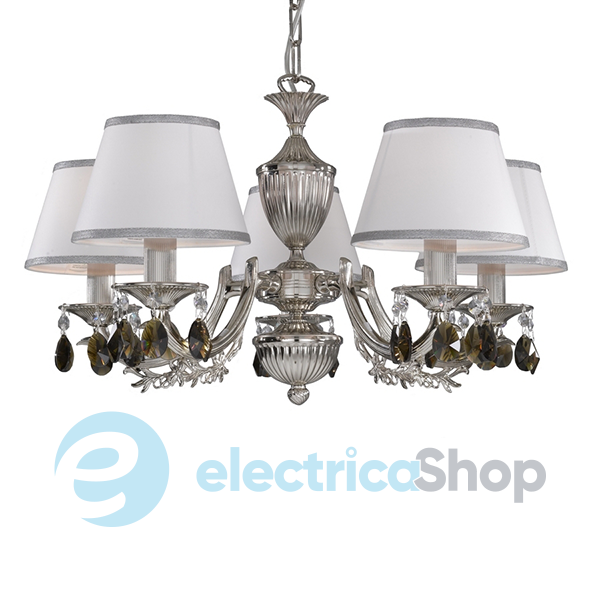 Люстра RECCAGNI ANGELO L 9831/5 Nichel Paralume bianco, cristalli fume буде гарно виглядати у вітальні, їдальні, спальні та інших класичних інтер'єрах. Основа виготовлена з металу (мельхіорове покриття), абажур текстильний (білий з мельхіоровим обрамленням), підвіски - з димчастого кришталю SCHOLER (Австрія).