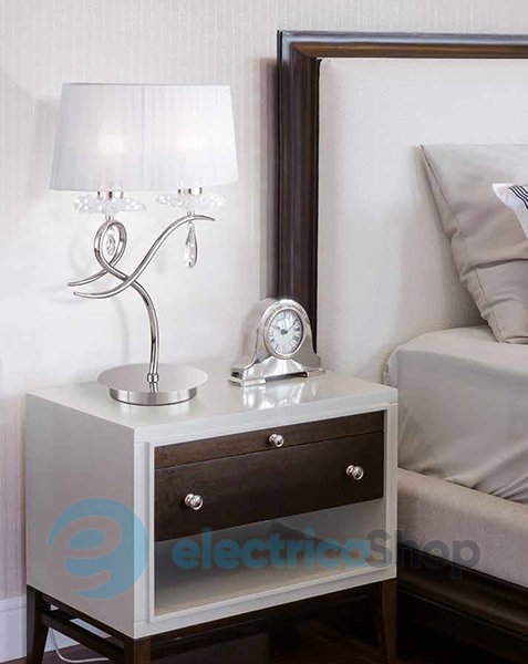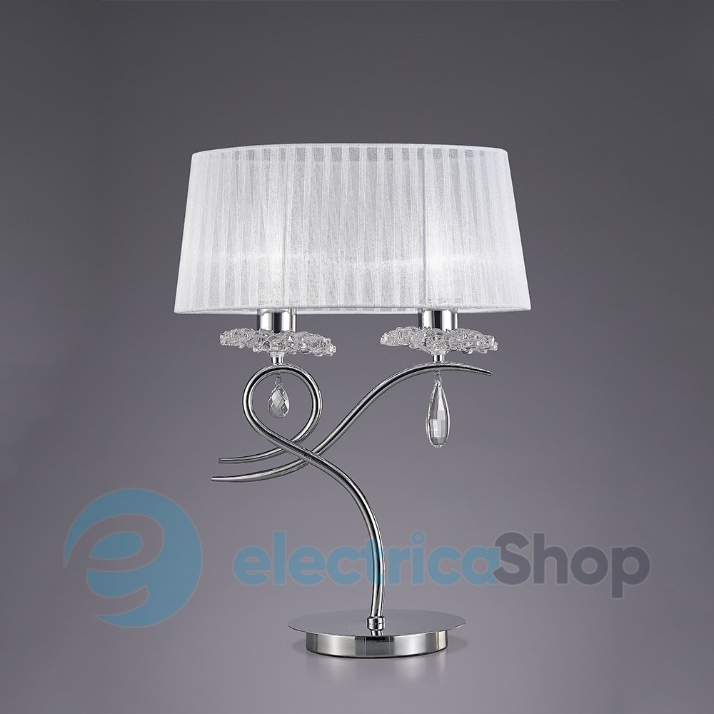 Настільна лампа Mantra LOUISE 5278 матиме гарний вигляд в класичних та сучасних інтер'єрах. Основа виготовлена з хромованого металу, плафон - з тканини, а підвіски - зі скла.