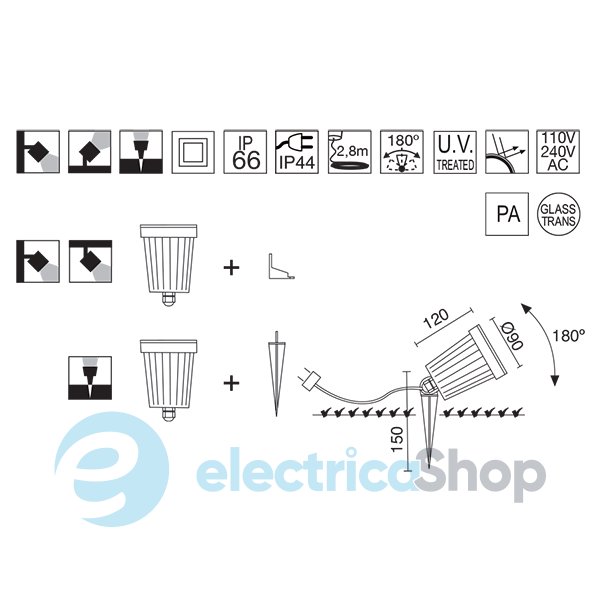 - Місце встановлення: На стіну, В грунт, Зверху на площину