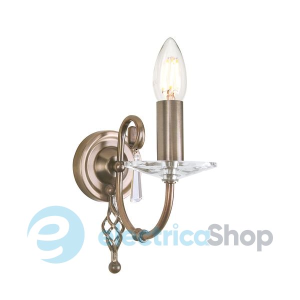 Настінний світильник Elstead Aegean (AG1 AGED BRASS) має витончене кування ручної роботи, яке підкреслюють кришталева підвіска-крапля та плафон у формі свічки.