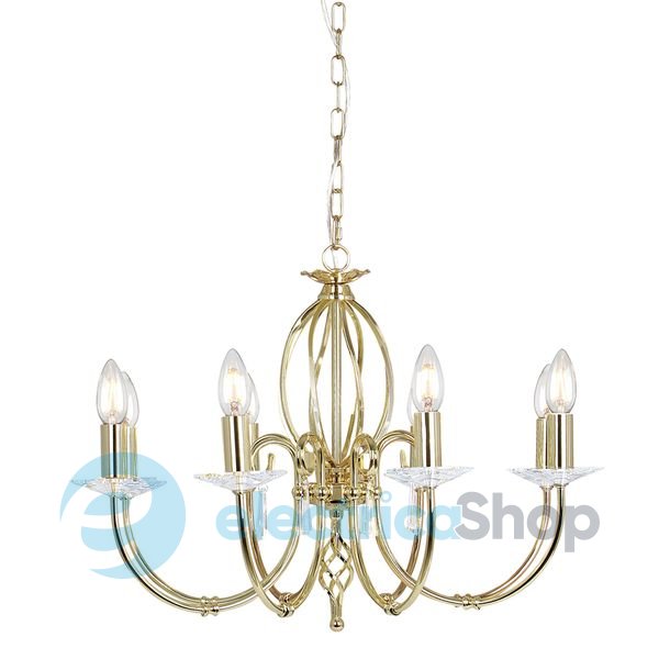 Люстра Elstead Aegean AG8 (POL BRASS) має витончене кування ручної роботи, яке підкреслюють кришталеві підвіски-краплі та плафони у формі свічок.