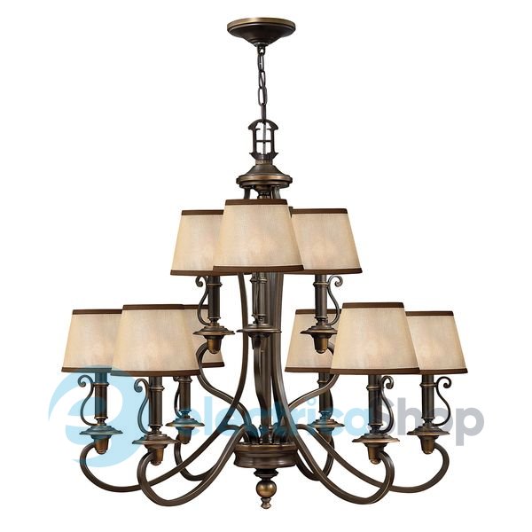 Люстра Elstead Plymouth HK/PLYMOUTH9 Hinkley стане справжньою окрасою для традиційного інтер'єру. Класичний дизайн, вінтажні свічки-гільзи з вигнутим литим оздобленням та потертим вручну оздобленням Old Bronze, плафони з відтінком світлої бурштинової органзи роблять колекцію Plymouth Elstead неповторною.