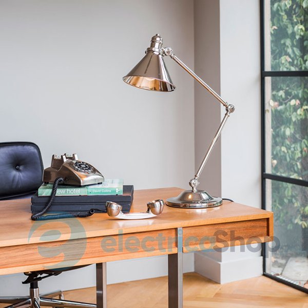 Настільна лампа Elstead Provence PV/TL PN матиме чудовий вигляд у приміщеннях, оформлених в стилі прованс, вінтаж. Виготовлена з металу. Колір – Polished Nickel (полірований нікель). Освітлювальний прилад оснащений спеціальними шарнірами, що дозволяє регулювати його положення.